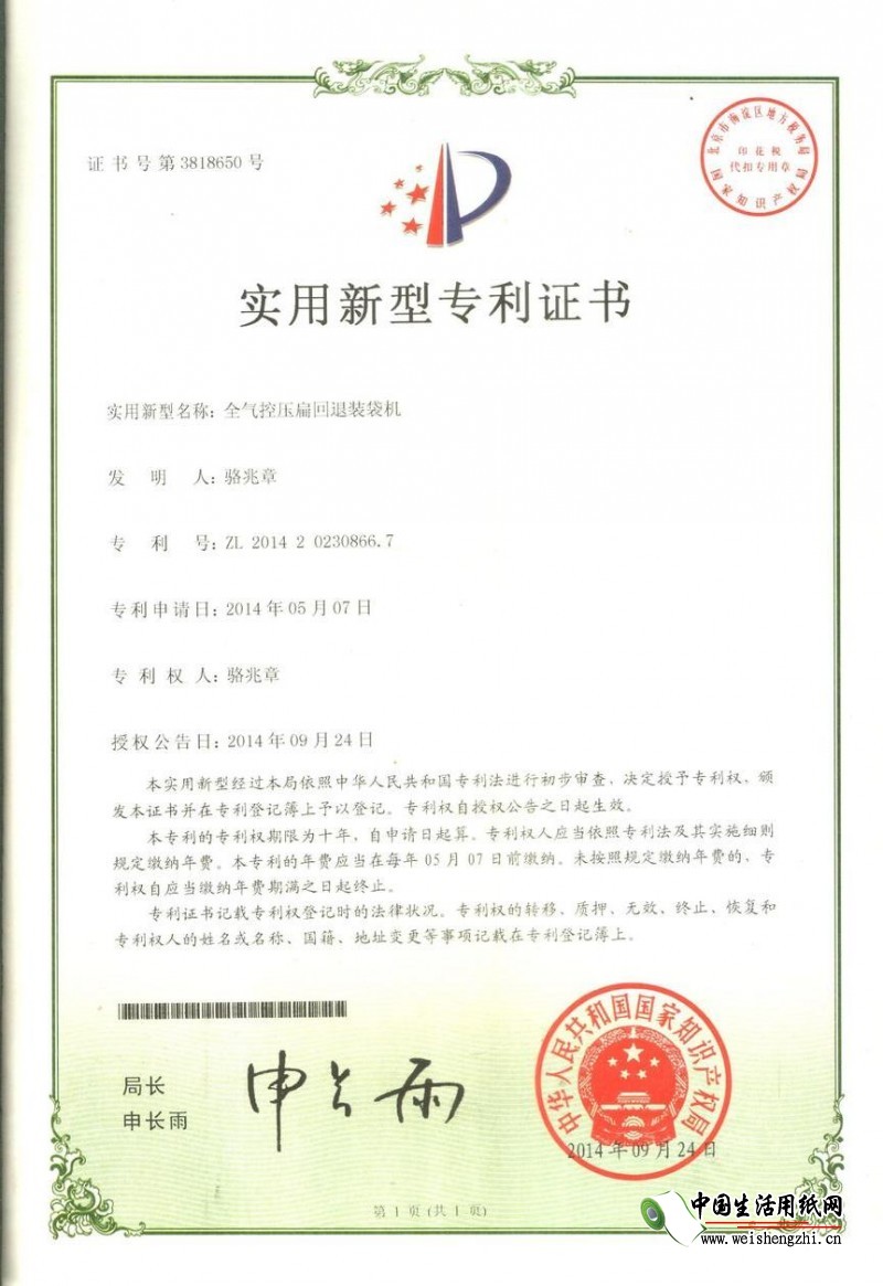 证书介绍 本机售全国独家配置气动PLC控制的新型机子。四代机是三代机的功能不变,升级而来的,压扁后再退回1_2.5公分,装出的中包平整、包包饱满。可使厂家的产品卖相更好。不象传统的压扁机是压扁后就装袋。包装出后太紧、卷纸甚至变型。装出的中包袋子短小。不知道的还以为是厂家给的分量不足呢