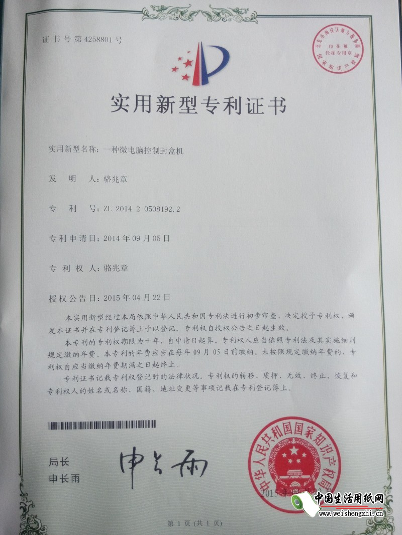 荣誉资质 封盒机专利证书