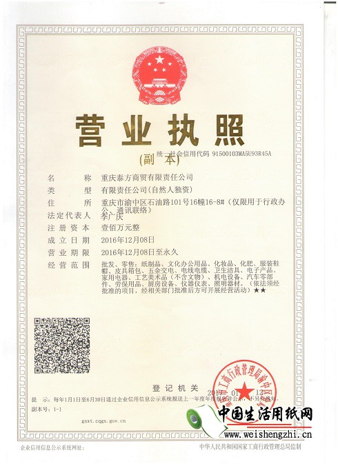 荣誉资质 证书介绍 重庆泰方商贸有限责任公司位于重庆市大渡口区马王兴龙路商社物流仓库,我公司主要经营品牌纸品代理,顺清柔生活用纸,A&S卫生巾、永芳卫生巾,哈利贝贝婴幼儿专用纸巾,哈里贝贝婴幼儿纸尿裤、成长日记婴幼儿纸尿裤、伴宁成人纸尿裤和护理垫片、洁昕湿纸巾。