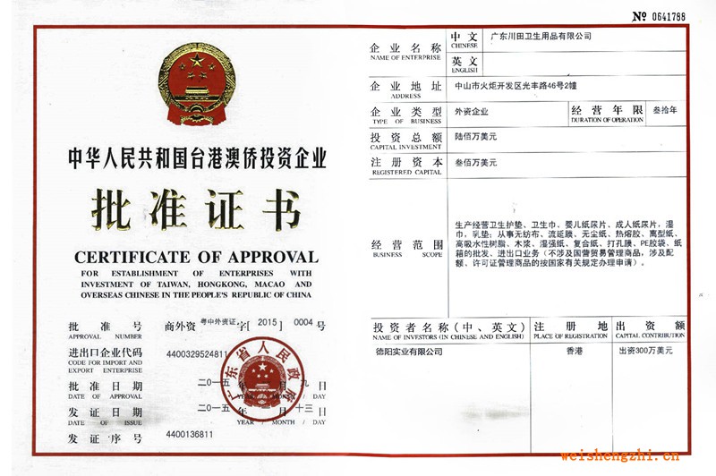 » 台港澳侨投资企业批准证书