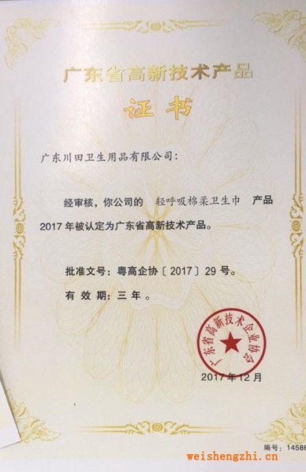 » 广东省高新技术产品证书(轻呼吸棉柔卫生巾产品)