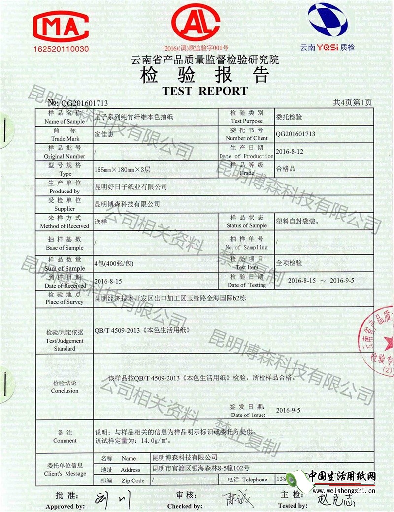 王子纯竹纤维本色生活抽纸质检报告,按照标准项目,所有指标全检,并全部合格!