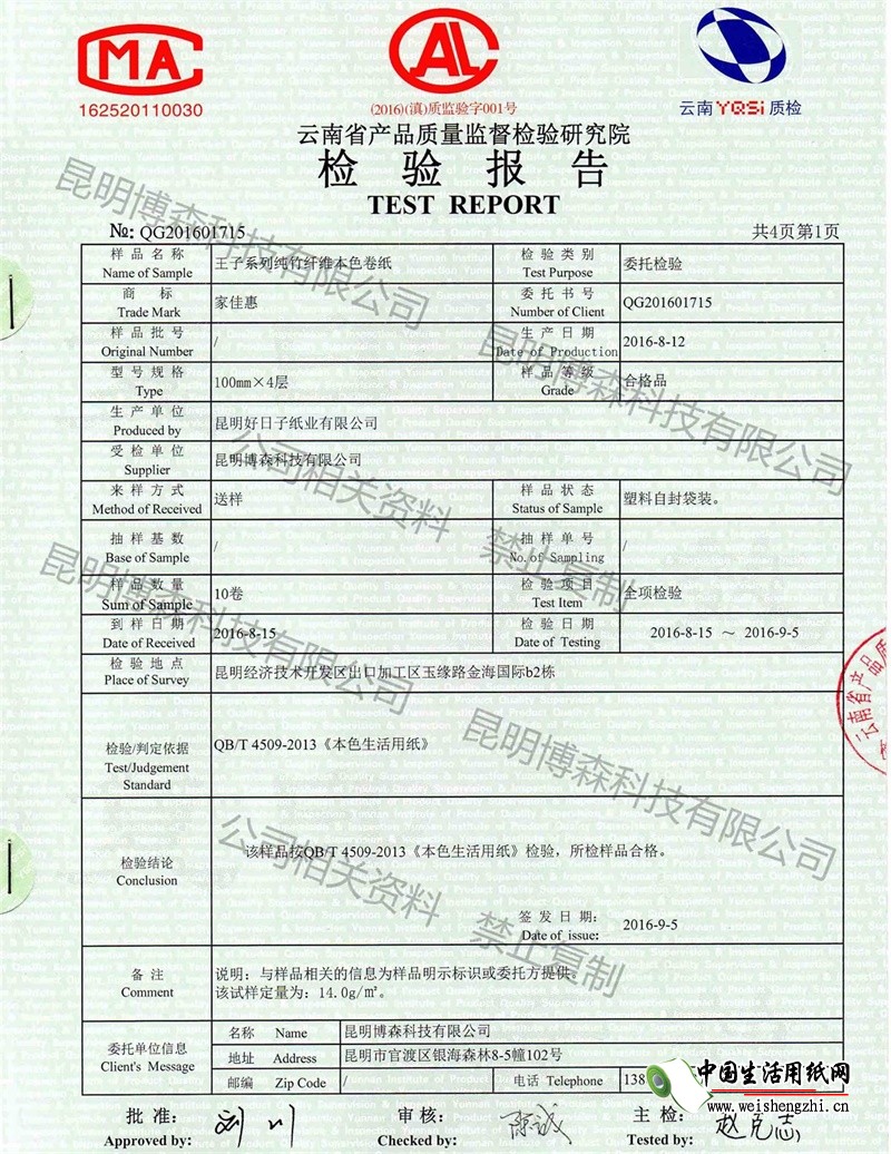 王子纯竹纤维本色生活卷纸质检报告,按照标准项目,所有指标全检,并全部合格!