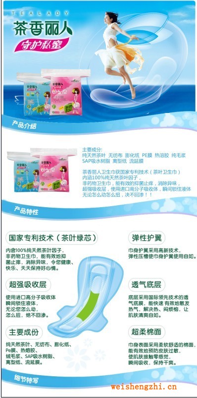 1、国家专利技术(茶叶绿芯)。内含100%纯天然茶叶因子,非药物卫生巾,能有效抑菌止痒,消除异味,令女性朋友健康、快乐、天天保持好心情。