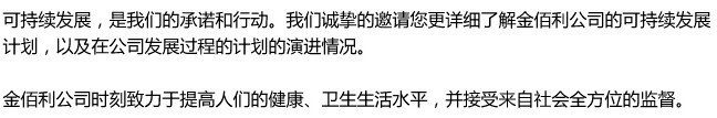 可持续发展是全世界面临的新发展课题,特别是对于正经历高速经济腾飞的中国,将可持续发展与经济发展、人民日益增长的物质文化需要相结合是我们维持长久、健康、快速业务增长的关键环节。在不断引进金佰利旗下一流高质量产品,对中国宝宝、女性、老人和中国家庭提供世界级关爱的同时,我们珍惜自然资源、保护生活环境、服务周围社区、关注人才发展,积极推动可持续发展的方方面面。
