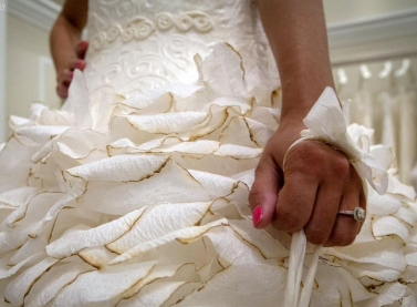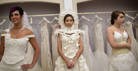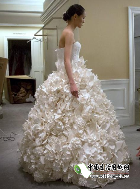 用一张张卫生纸精心折叠、粘贴而成的卫生纸婚纱。时尚前卫的设计,裙摆以花边装饰,乍看上去,这些婚纱的外观华美异常,质感就像真正的织品一样,几乎跟普通婚纱没有任何区别。你看见过卫生纸做的婚纱吗?