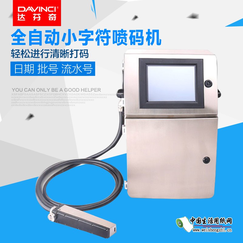 达芬奇卫生纸日期小字符喷码机采用国际先进的球式黏度计和利用墨流速度、泵压、及墨点飞行速度等多重方法控制墨水粘度自动检测调整。全彩触摸屏,中英文菜单转换,自带图文编辑功能。本机采用32位嵌入式CPU及触摸屏进行操作,可存储2000条打印信息。多任务工作系统设置,喷印编辑同时进行,不需要停止生产线正常工作。