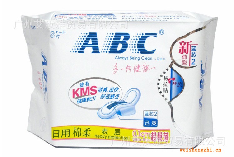 - 产品名称:ABC 日用超极薄棉柔排湿表层卫生巾 包装数量(片): 8 片/包