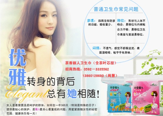 卫生巾品牌“茶香丽人”是公司的主导品牌之一,该品牌秉承“专业化、国际化、亲情化“的宗旨,用温、亲切专业的高质服务给予女性朋友细致、贴心的呵护,为女性健康成长创造舒适快乐的环境,。