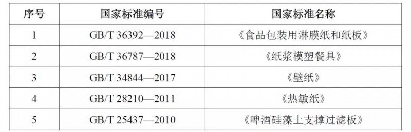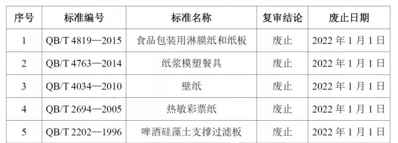 工业和信息化部2020年12月31日发布公告(中华人民共和国工业和信息化部公告2020年第51号),公告了一批行业标准的复审结论。其中,QB/T 4819—2015《食品包装用淋膜纸和纸板》等五项造纸行业标准予以废止,废止日期均为2022年1月1日。具体情况如下: