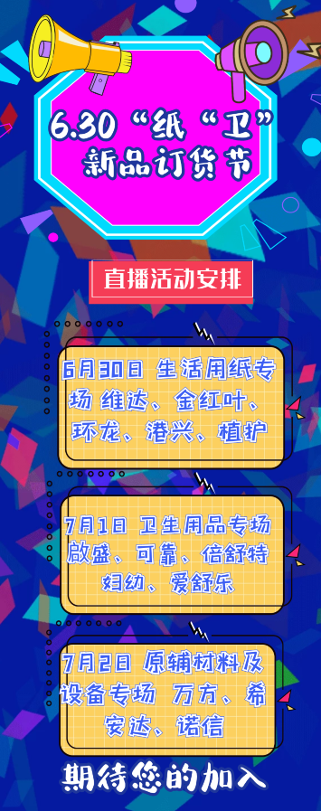 设有生活用纸、卫生用品、原辅材料和设备3大直播专场。维达、金红叶、可靠、倍舒特妇幼等10+全产业链知名企业将进行线上新品推介直播,详细讲解新品特点,并带来极为丰富的订货优惠政策及福利,为年中选品的“你”带来更多选择!