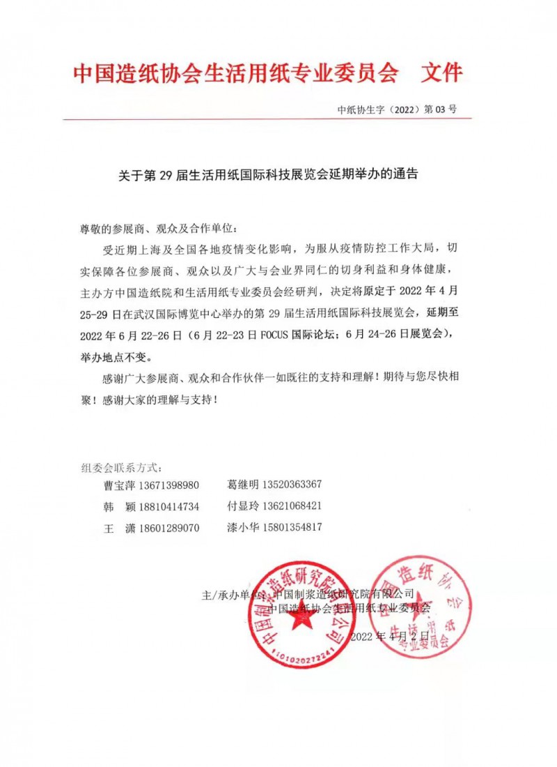 关于第29届生活用纸国际科技展览会延期举办的通告