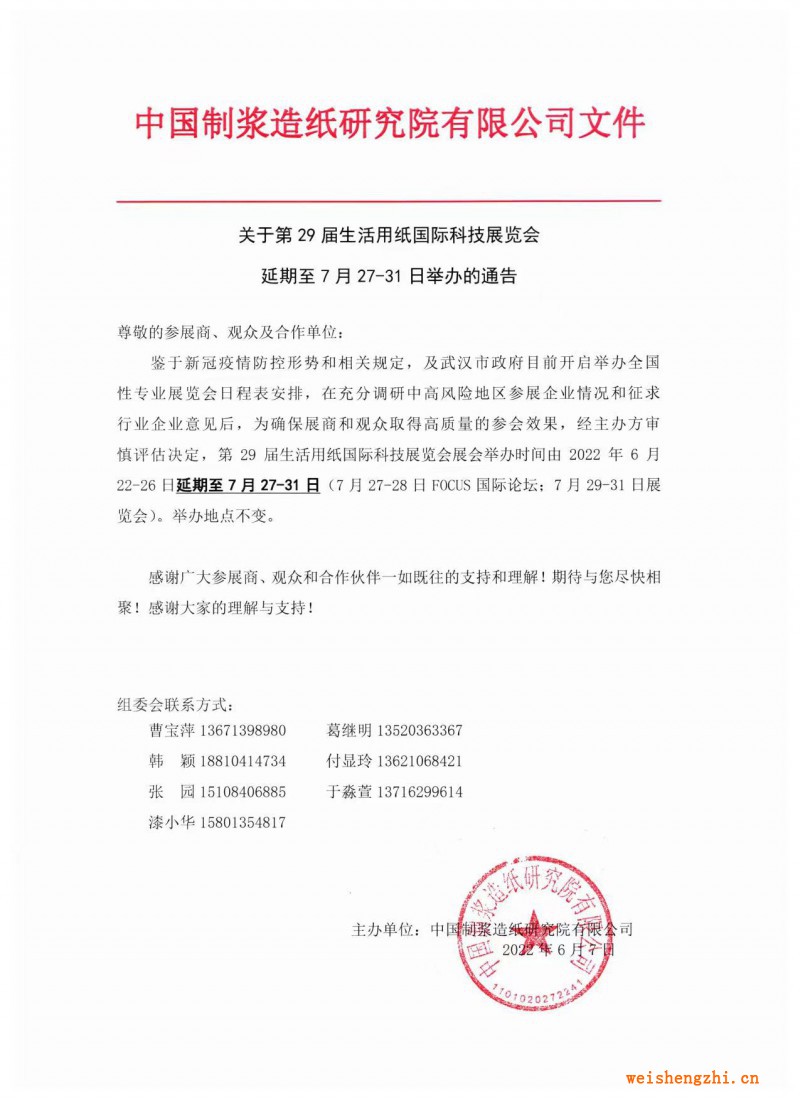 【重要通知】鉴于新冠疫情防控形势和相关规定,及武汉市政府目前开启举办全国性专业展览会日程表安排,在充分调研中高风险地区参展企业情况和征求行业企业意见后,为确保展商和观众取得高质量的参会效果,经主办方审慎评估决定,第29届生活用纸国际科技展览会展会举办时间由2022年6月22-26日延期至7月27-31日(7月27-28日FOCUS国际论坛;7月29-31日展览会)。举办地点不变。特装图纸报图时间延期至2022年7月2日以前,请悉知!