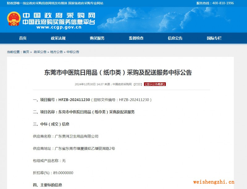 | 1 | 广东美鸿卫生用品有限公司 | 东莞市中医院日用品(纸巾类)采购及配送服务 | 按招标文件要求 | 按招标文件要求 | 按招标文件要求 | 按招标文件要求 |