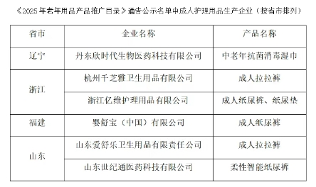 6家成人纸尿裤、湿巾等生产企业入选《2025年老年用品产品推广目录》