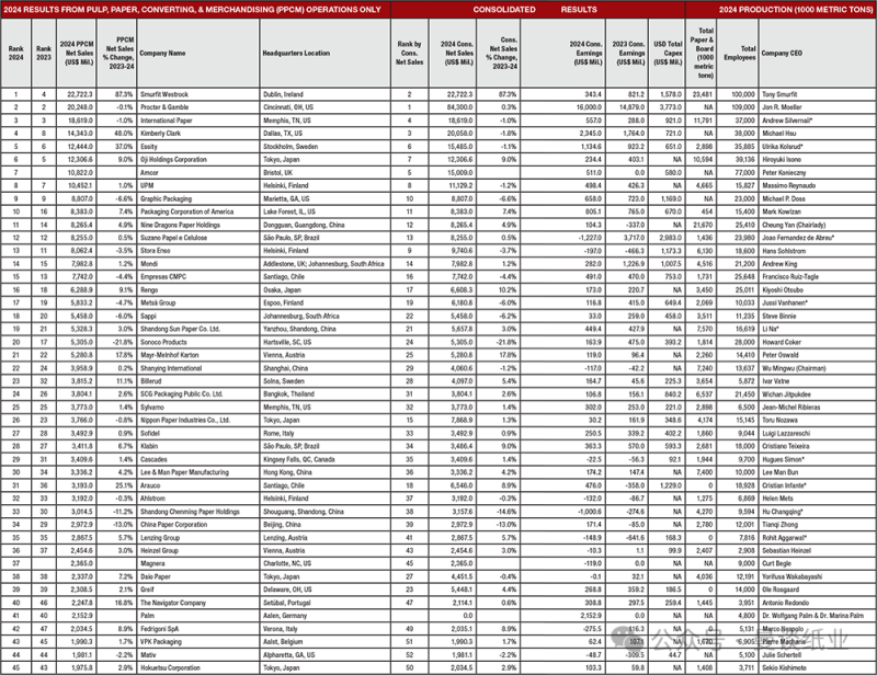 前一年增速最快的太阳纸业在2024年依旧实现了增长,尽管增速下降,但排名上升到第19位,首次进入全球前20强。
