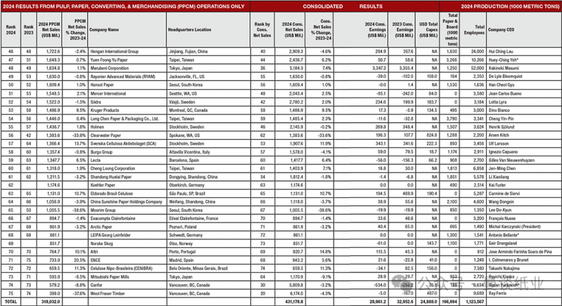 “前75强”名单列出了必须披露财务业绩的上市公司。一些重要公司,例如Irving、Georgia-Pacific、Kruger、APP、Twin Rivers、Paper Excellence、Sustana和APRIL,没有这项义务,因此未被列入此名单。