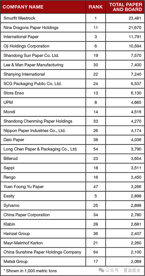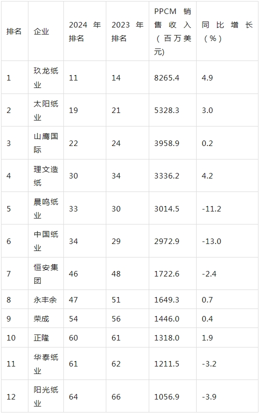 港企理文造纸销售收入同比增长4.2%,增速列中国企业第2位,首次进入全球前30强。