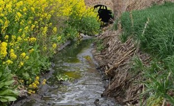 白云纸业的污水从郭庄村附近流入奎旺河支流中,污水沟两边是油菜与小麦。