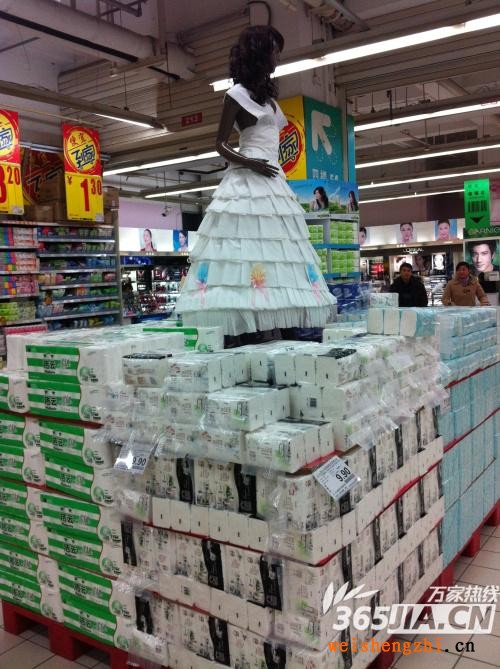 在家乐福超市卫生纸售卖专柜处记者发现,一幅黑色女性假模特摆放在卫生纸纸堆里,而这幅模特与众不同的正是她那身上穿着的婚纱,这套婚纱的材质正是用超市内的卷纸手工制作而成,这一惊人举措,便引来不少前来购物的顾客叹为观止,一一掏出手中的手机对其拍摄。