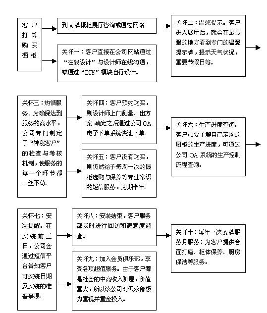 正常情况下,品牌传播始于第一个W,即通过广告宣传让消费者记住品牌名称和诉求。而当企业的广告投入连年增加,但业绩却不会增加时,就必须及时转变传播思路,朝产品差异化和服务差异化等方面努力!前文提到的雪津啤酒是产品差异化传播的优秀典型。而在品牌传播的第三个W上,除了海尔的五星级服务,也不乏优秀的企业。如万科地产,其创建的“万科会”(万科地产会员俱乐部),培育了老客户的忠诚度,为其新楼盘贡献30%左右的业绩。而国内某知名橱柜品牌,更是凭着“客户关怀”这一绝招,在征战全国市场过程中屡建战功。以下是该品牌“客户关怀”系统: