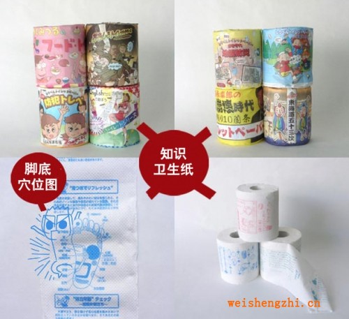 知识性卫生纸:如题,卫生纸上印有多种知识点,英语教学,地震防灾,脚底按摩穴位等等,值得向学校和全社会推广的带有一定公益性的趣味用品。