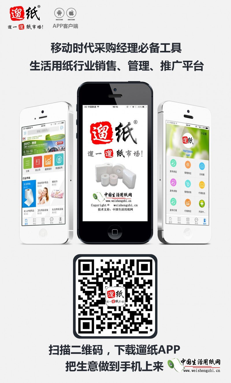中国生活用纸网——遛纸APP平台,是您随时随地掌握新招商资讯、查阅供求信息、把握市场脉搏的掌上平台。中国生活用纸网,天天都是生活用纸展!更多精彩增值服务,尽在登录“遛纸APP”、“中国生活用纸网”!!!