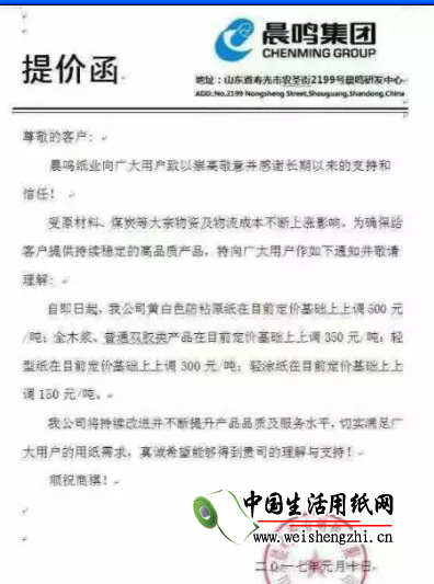 2016年12月14日,晨鸣纸业曾发布一份涨价函,公司表示,全木浆系列产品即日起上调200元/吨,且2017年2月3日起继续上调200元/吨。