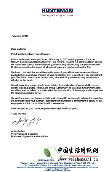 文章大意:亨斯迈芬兰波里钛白工厂2月1日发生不可抗失火事件,由此导致亨斯迈无法合理控制工厂运转,迫使其无法保障在波里工厂所生产的各类型和级别的产品供应。