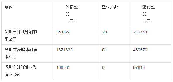此次欠薪的24家企业中,欠薪多的企业为深圳海健印刷公司,欠薪达132万余元,政府垫付工资达48万余元,垫付人数达51人。