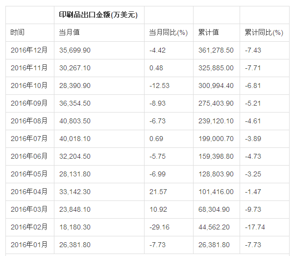 2016年12月我国印刷品出口金额3.57亿美元,当月同比下降4.42%;2016年全年出口金额累计36.13亿美元,累计同比下降7.43%。