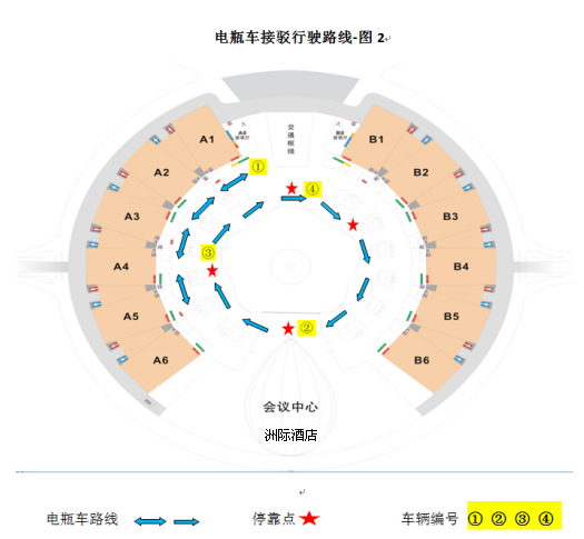 ●封闭区域外,②、③、④号车;从洲际酒店会议中心—A4入口—A0/B0登录厅入口—B2馆出口—会议中心,整圈循环行驶。想往返A区、B区、洲际酒店的观众,只需招招手,就能搭上“顺风车”。