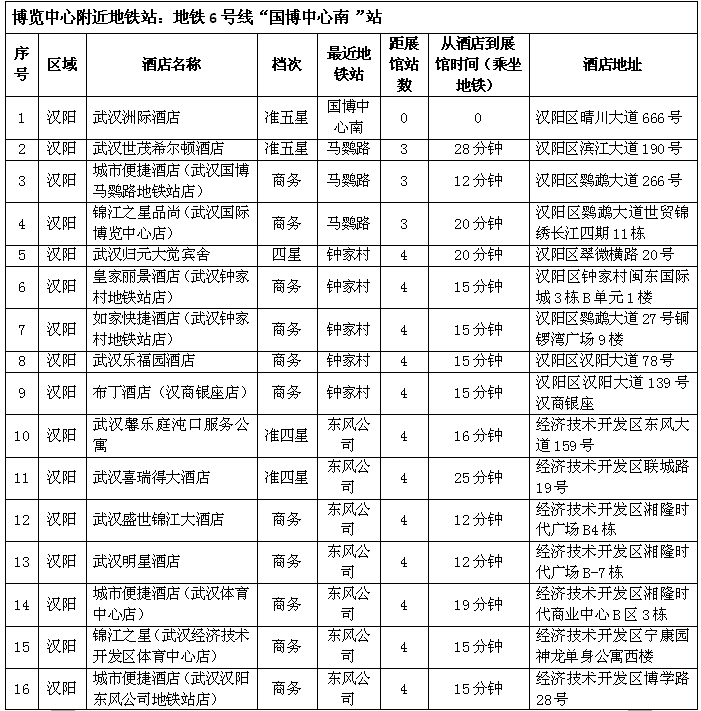 鉴于博览中心周边酒店、交通等配套设施尚未完善,建议参会人员提前预订地铁6号线沿线酒店。博览中心附近部分酒店名录如下: