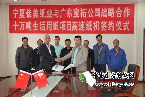 2017年4月17日,宁夏佳美纸业与广东宝拓公司十万吨高档生活用纸项目高速纸机战略合作签约仪式在宁夏吴忠市隆重举行。双方签订第一期项目两台高速卫生纸机,宝拓为佳美纸业提供两台C1300-3550新月型卫生纸机,设计车速1300m/min,幅宽3550mm,供货范围为整体交匙钥工程(包括制浆、造纸、后加工和包装)。