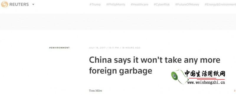 核心提示: 中国于周二正式通知世界贸易组织(WTO),表示今年底开始将不再接收外来垃圾,包括废弃塑胶、纸类、废弃炉渣、与纺织品。而禁令将会于2017年年底生效。 英国路透社7月19日报道称,中国在送交WTO中的文件表示,