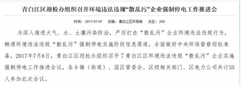 2017年7月6日,青白江区发布消息称,为了全面做好中央环保督察迎检准备,迎检办组织召开了青白江区环境违法违规“散乱污”企业实施强制停电工作推进会议。