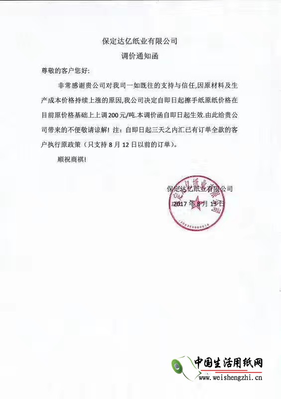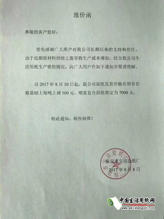 保定市宝洁造纸厂涨价函: