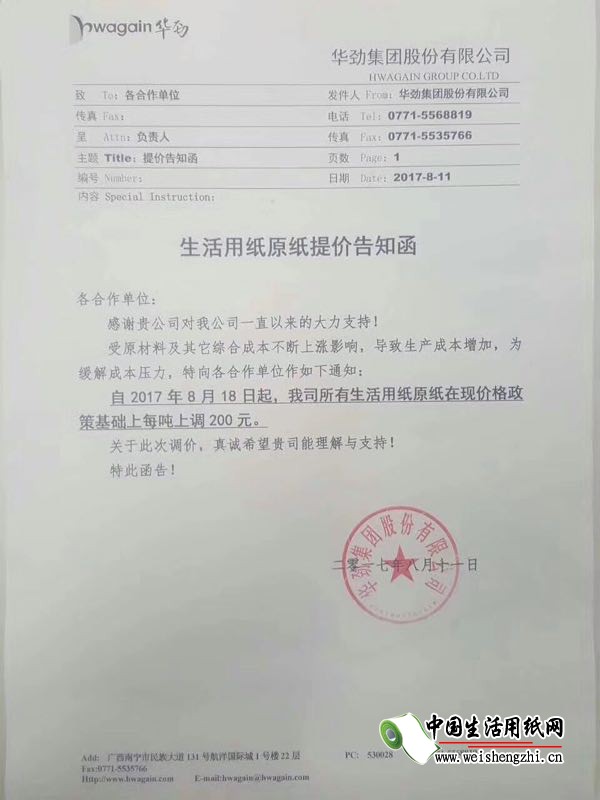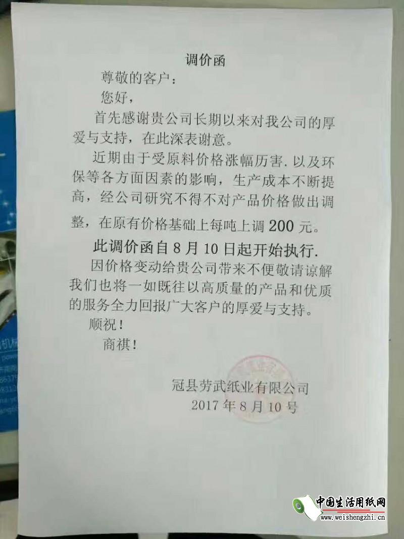 冠县劳武纸业有限公司涨价函: