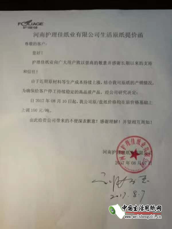 河南护理佳纸业有限公司生活原纸涨价函: