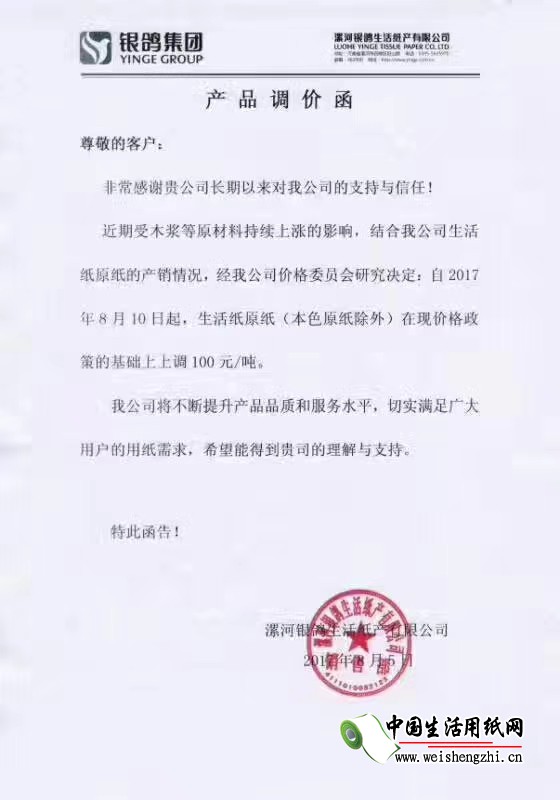 河南银鸽生活用纸产有限公司涨价函: