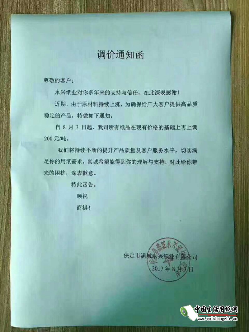 保定市满城永兴纸业有限公司涨价函:
