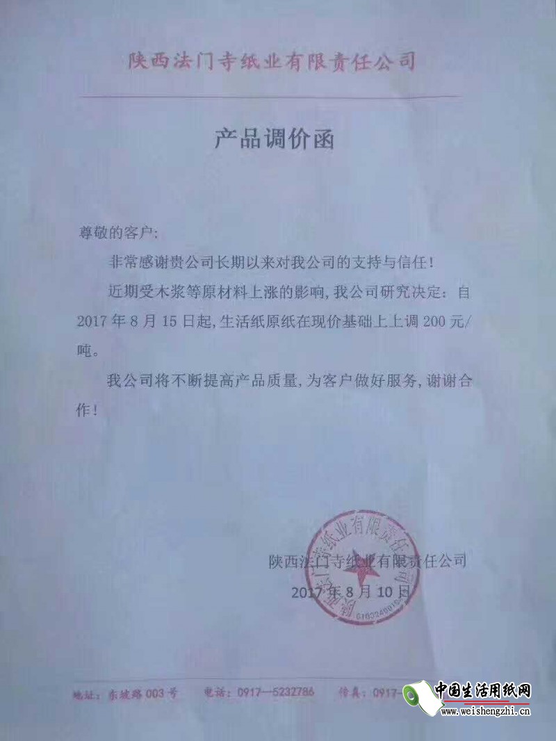 陕西法门寺纸业有限责任公司涨价函: