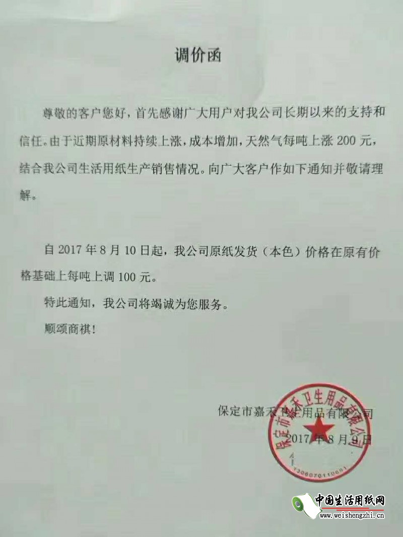 保定市嘉禾卫生用品有限公司涨价函: