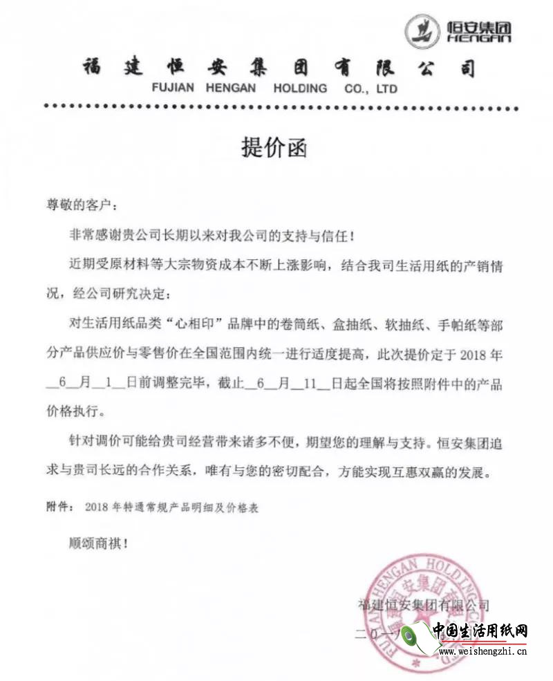 恒安集团:生活用纸品类“心相印”品牌中的卷筒纸、盒抽纸、软抽纸、手帕纸等部分产品供应价与零售价在全国范围内统一适度提高,6月1日调整完毕,6月11日全国执行;