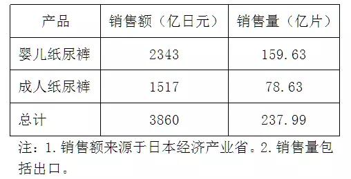 据日本卫生材料工业联合会(JHPIA)统计,2017年日本纸尿裤总销售额3860亿日元,纸尿裤总销售量达237.99亿片。