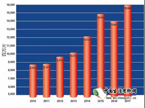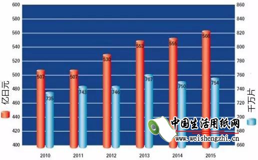 日本女性卫生用品市场虽面临适龄女性人口减少的严峻形势,但仍然在稳步增长。各生产厂推出的具有新功能和高端化的卫生巾产品,很好地满足了消费者多样化的诉求。图6显示,2010-2015年期间,日本卫生巾/护垫销售量持续增加。