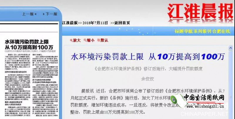 环保问题是近几年抓的比较紧的问题,绿水青山就是金山银山。为了解决污染问题各省的政策层出不穷,近日,安徽合肥市环保局公布了修订后的《合肥市水环境保护条例》,从7月起正式实行。新的《条例》施行后,加大了对水环境污染的处罚力度,大幅提升罚款额度,增加环境违法成本,一旦违反,将被责令改正或者责令限制生产、停产整治,罚款上限由10万元提高到100万元。