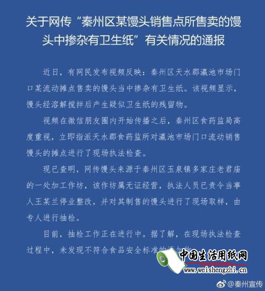 8月8日14:41分,微博名为@武山事儿的网友发出一段“纸馒头”的视频,配文称,有网友爆料:天水郡菜市场门口买的馒头疑似是用卫生纸做的,并@天水食药监询问其是真是假。微博发出过后,立即引发网友热议。
