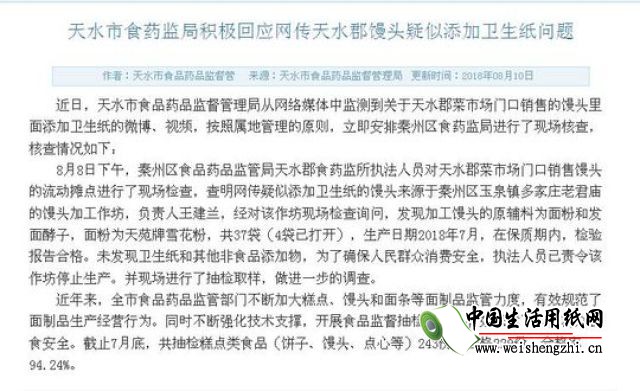 8月10日,记者联系到了秦州区委宣传部相关负责人,该负责人表示,目前执法人员已经责令当事人王某兰停业整改,并对其制售的馒头进行了现场取样,由专人进行抽检。天水市食品药品监督管理局则表示,检验报告合格,并未发现卫生纸和其他非食品添加物。