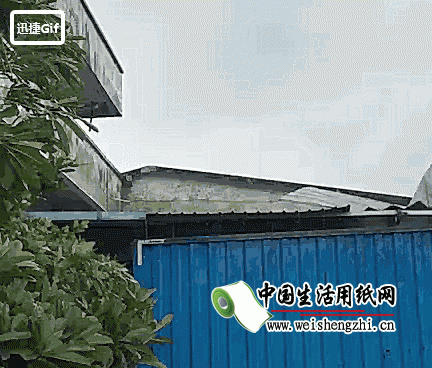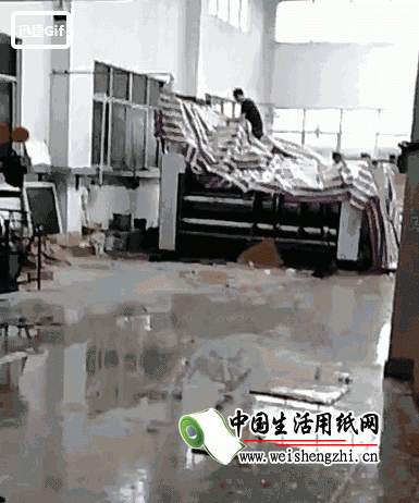 纸板车间屋顶成片被揭开,大量原纸被水浸泡